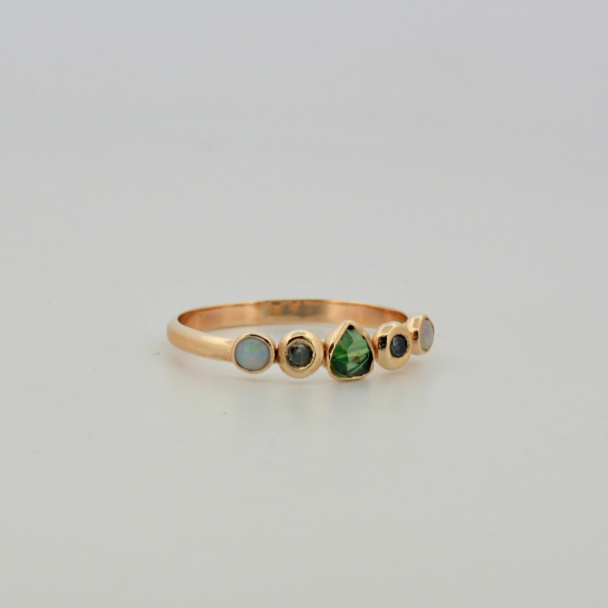 This size 7.5 ring crafted in 14k gold features a flush-set 4mm rose-cut Montana Sapphire, complemented by two 2mm Canadian salt and pepper diamonds and two 3mm Australian Opals.