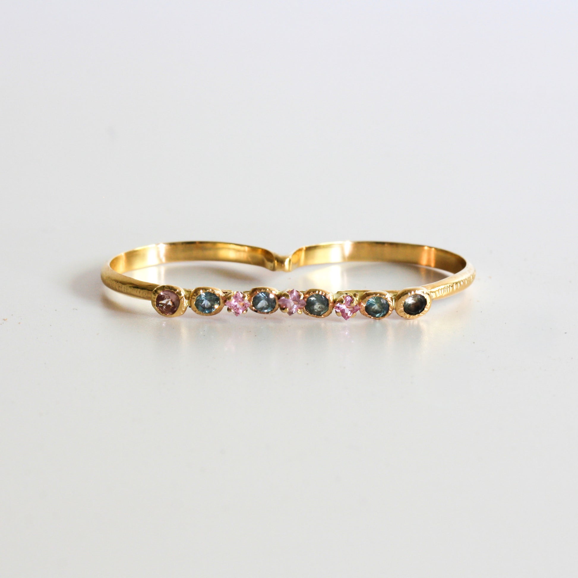 14k fairmined gold two-finger ring fits any finger sizes between 6.5-8.5. Set with .72ct of Montana sapphire, .18ct of Madagascar pink princess cut sapphire, and .20ct of Brazilian watermelon tourmaline. Hammer textured for glitter with fun pop of teals and pink