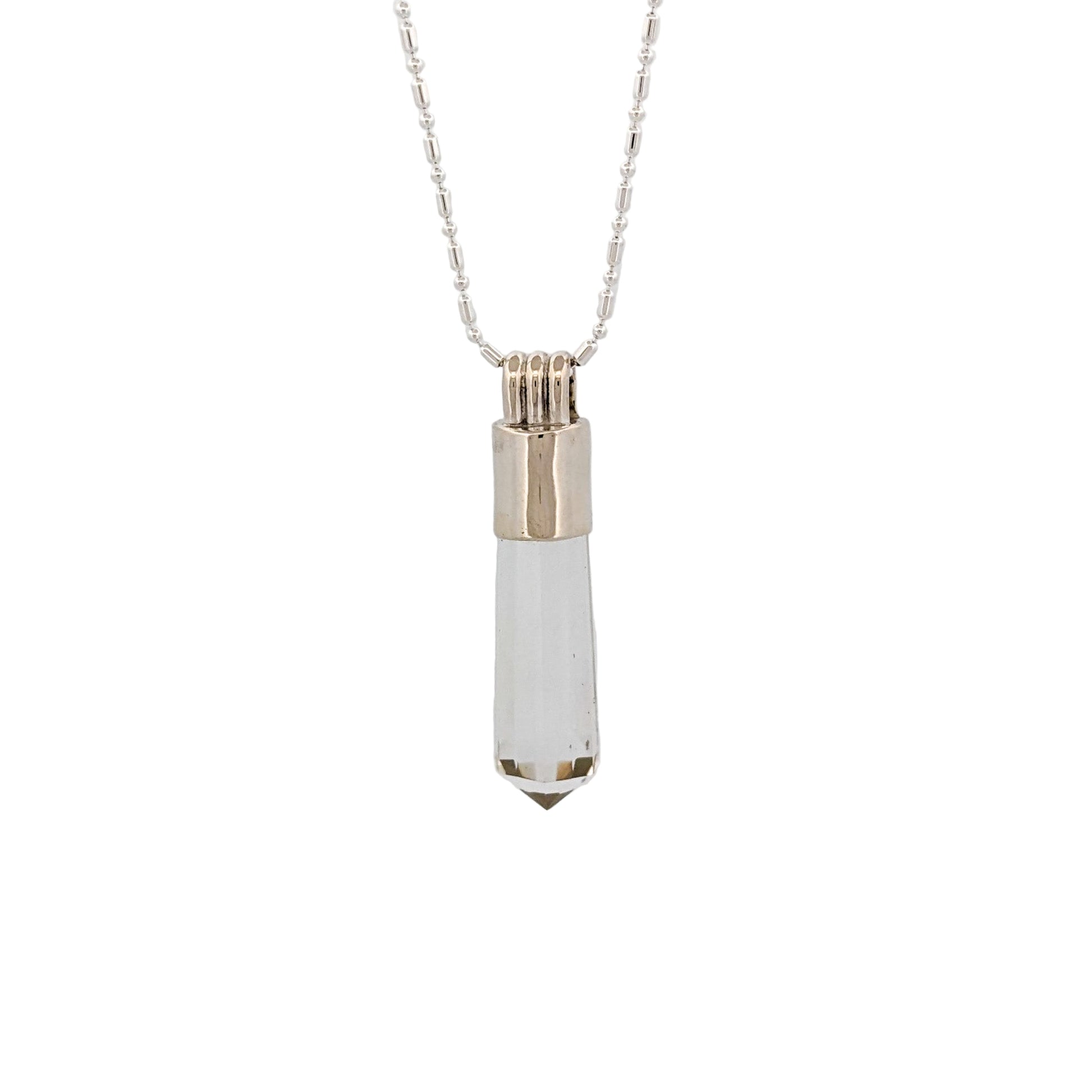 1.5" long Vogal cut Brazilian Clear Quartz set in Recycled Sterling Silver on an 18" 1.6mm oval ball chain