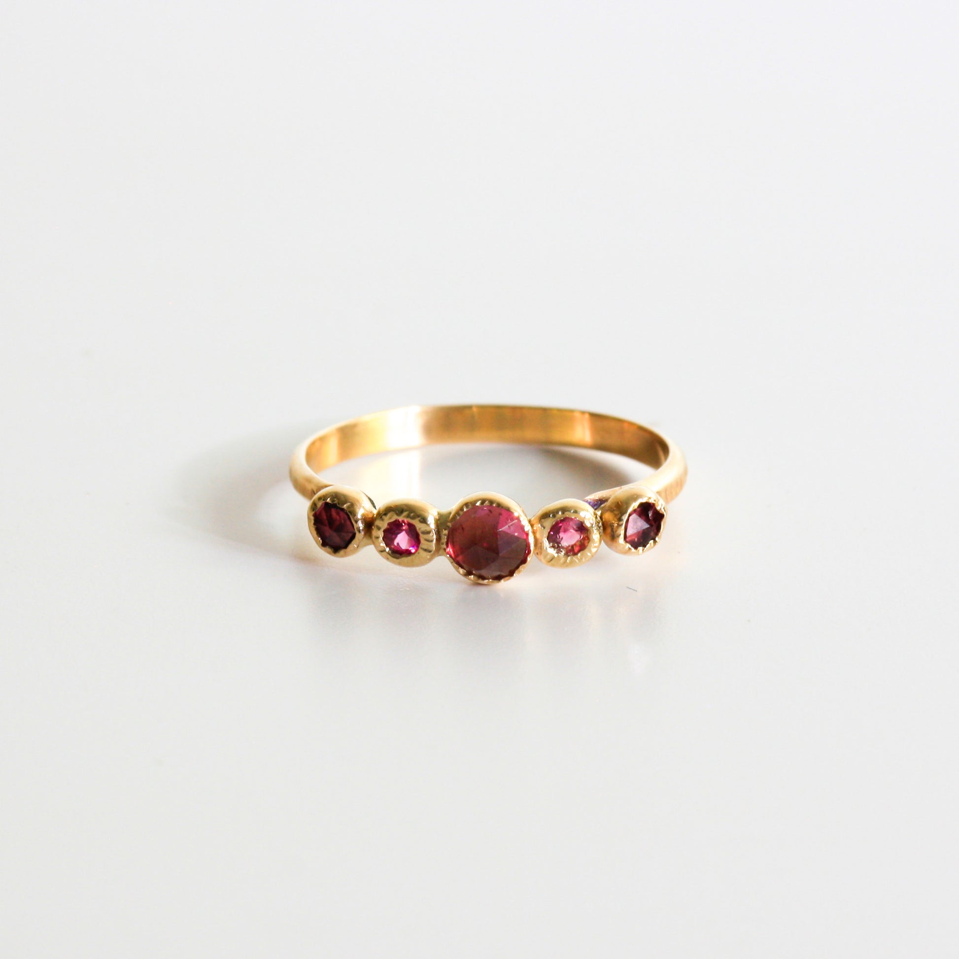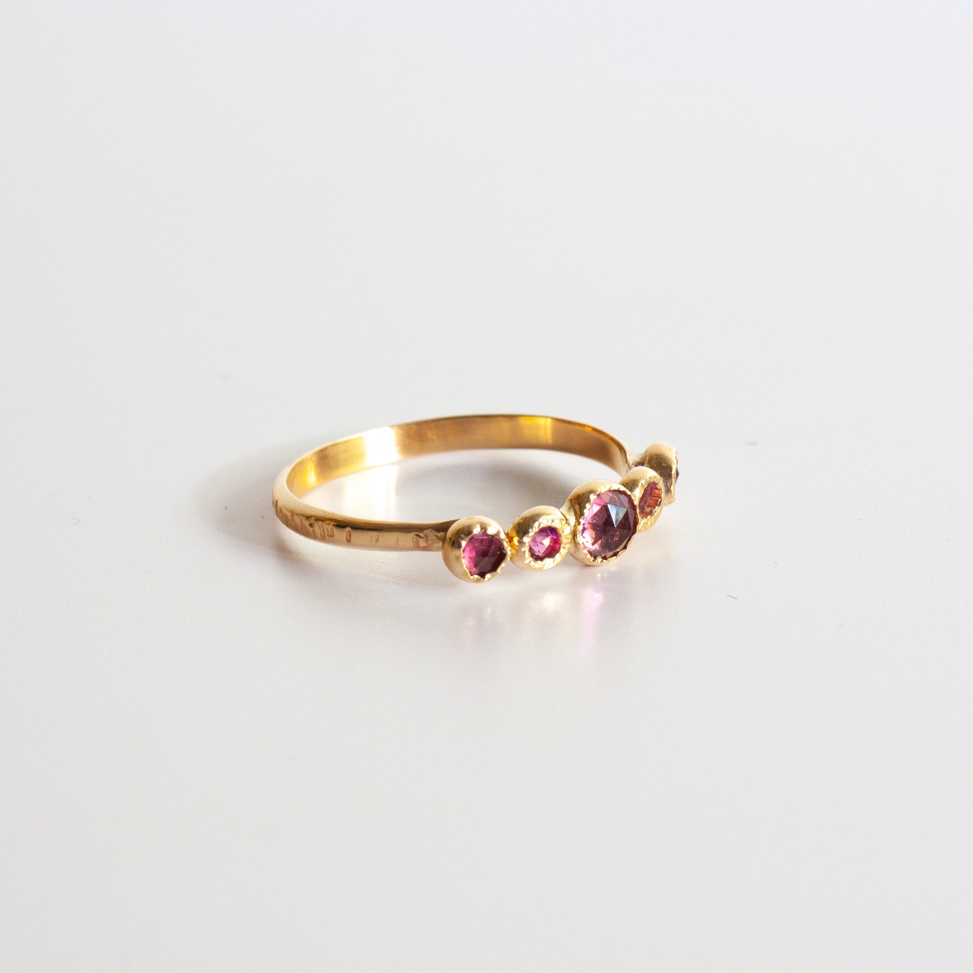 Crafted in 14k fairmined yellow gold, this hammered Quinn ring dazzles with five rose-cut tourmalines—one 4mm, two 3mm, and two 2.5mm—flush set to catch the light beautifully. The hammered texture on the band adds extra sparkle, making it a striking piece that combines ethical luxury with captivating design.